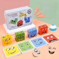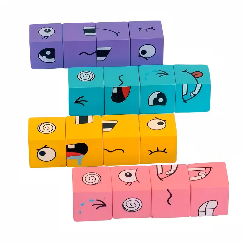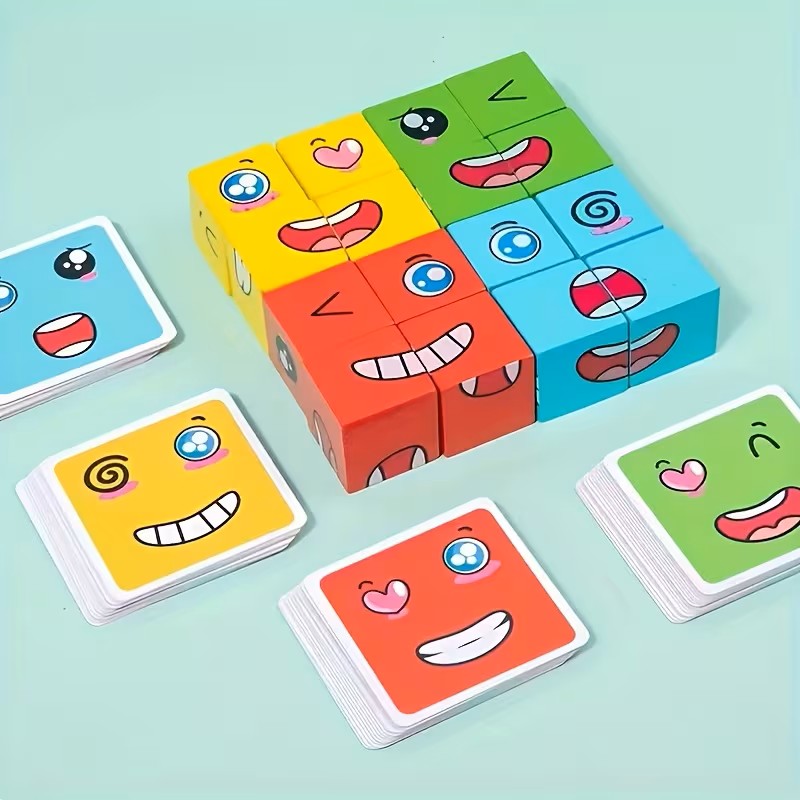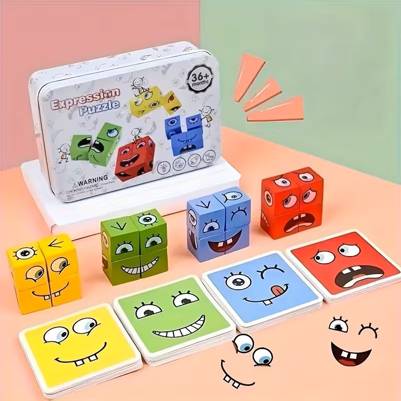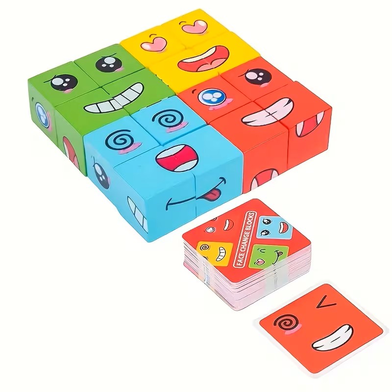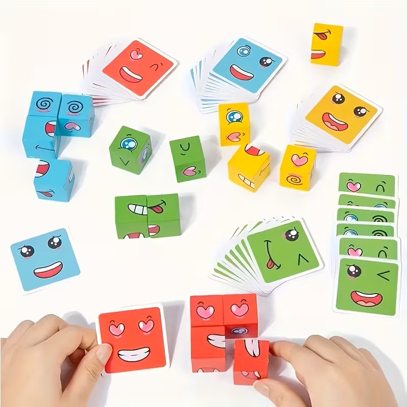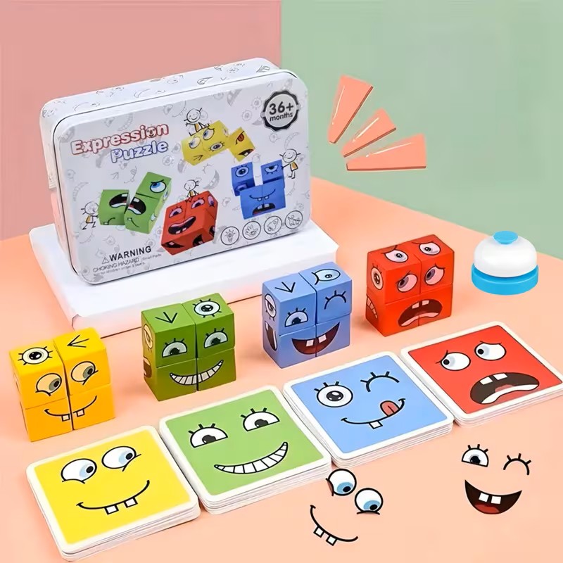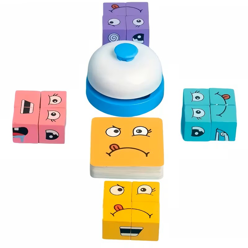 Bloques de Construcción de Madera Cambia-Cara, un Conjunto Mágico de Cubos de Madera Cambia-Cara, Equipado con Campana de alerta, cartas con diseño de caras y estuche de metal para su conservación, Diseñado para Fomentar la Creatividad e Imaginación, Adecuado para Juegos Interactivos Padres-Hijos, Juguetes Educativos para Niños
