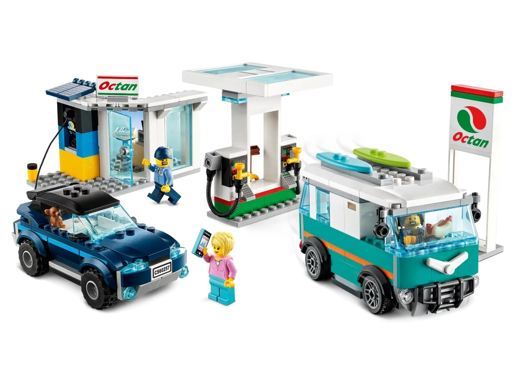 Los niños que sientan pasión por los coches de juguete quedarán cautivados con el juego LEGO® City Gasolinera (60257), que presenta una estación de servicio para vehículos eléctricos y de gasolina. Puedes enchufar el todoterreno para una recarga de Octan E, llenar el depósito de la furgoneta en el surtidor o visitar la tienda. Con las minifiguras de un encargado de la Gasolinera, un conductor y 2 surferos, además de la figura de un perro chihuahua, los niños pueden disfrutar de juego independiente y diversión sin límites. Una divertida experiencia de construcción En la caja encontrarás las instrucciones de construcción para este juguete LEGO City. También puedes conectarte a Internet y descargar Instructions PLUS, disponible como parte de la app LEGO Life para smartphones y tabletas. Geniales juguetes para niños ¡Los juegos de vehículos LEGO City presentan una variedad de superdivertidos juguetes construibles sobre ruedas!