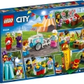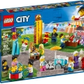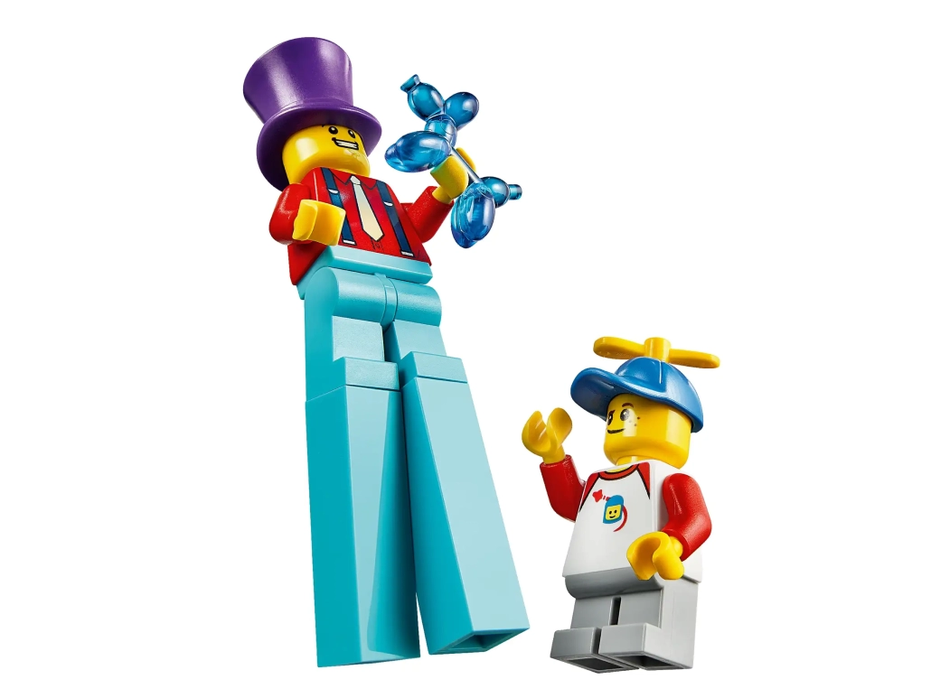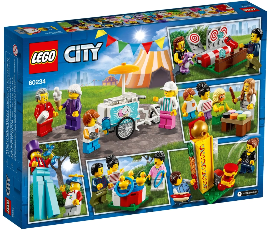 Incluye 14 minifiguras LEGO® City: un zancudo, 2 niños, 2 niñas, 2 adolescentes, un abuelo, una abuela, una mamá, un papá, una artista pintacaras, un vendedor de helados y un feriante.