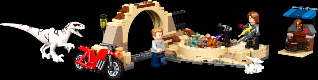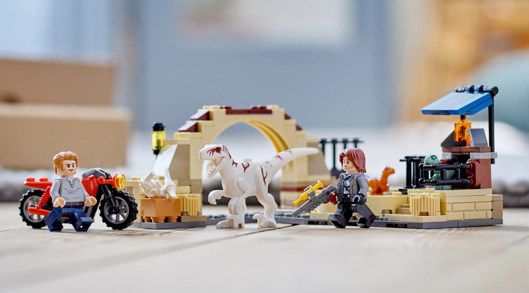 2 minifiguras LEGO® y dinosaurios: Owen Grady y Rainn Delacourt con un arma de dardos tranquilizantes, así como una figura articulada de un Atrocirraptor y 2 figuras de juguete de pequeños dinosaurios para interpretar emocionantes historias