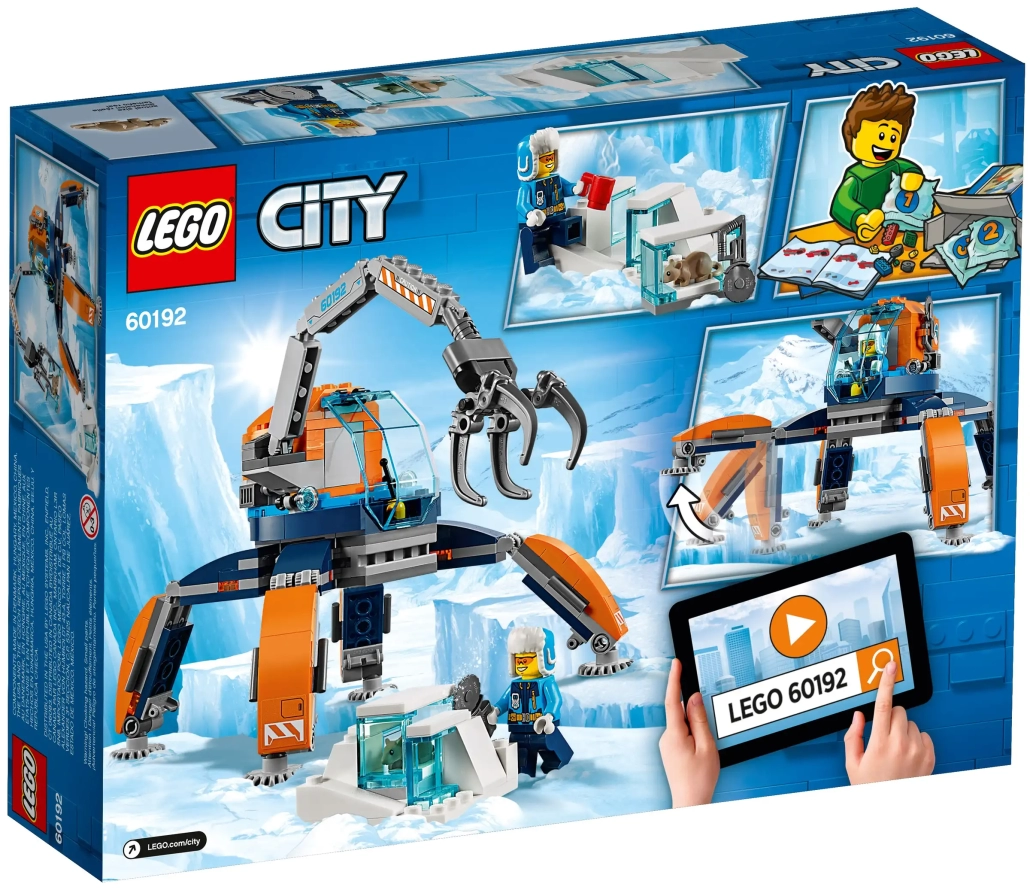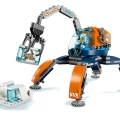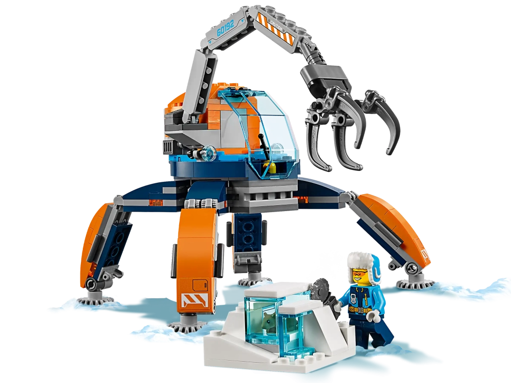 Contiene un Robot Glacial con piernas articuladas, cabina abatible con espacio para una minifigura y un brazo articulado con pinza robótica que se abre.